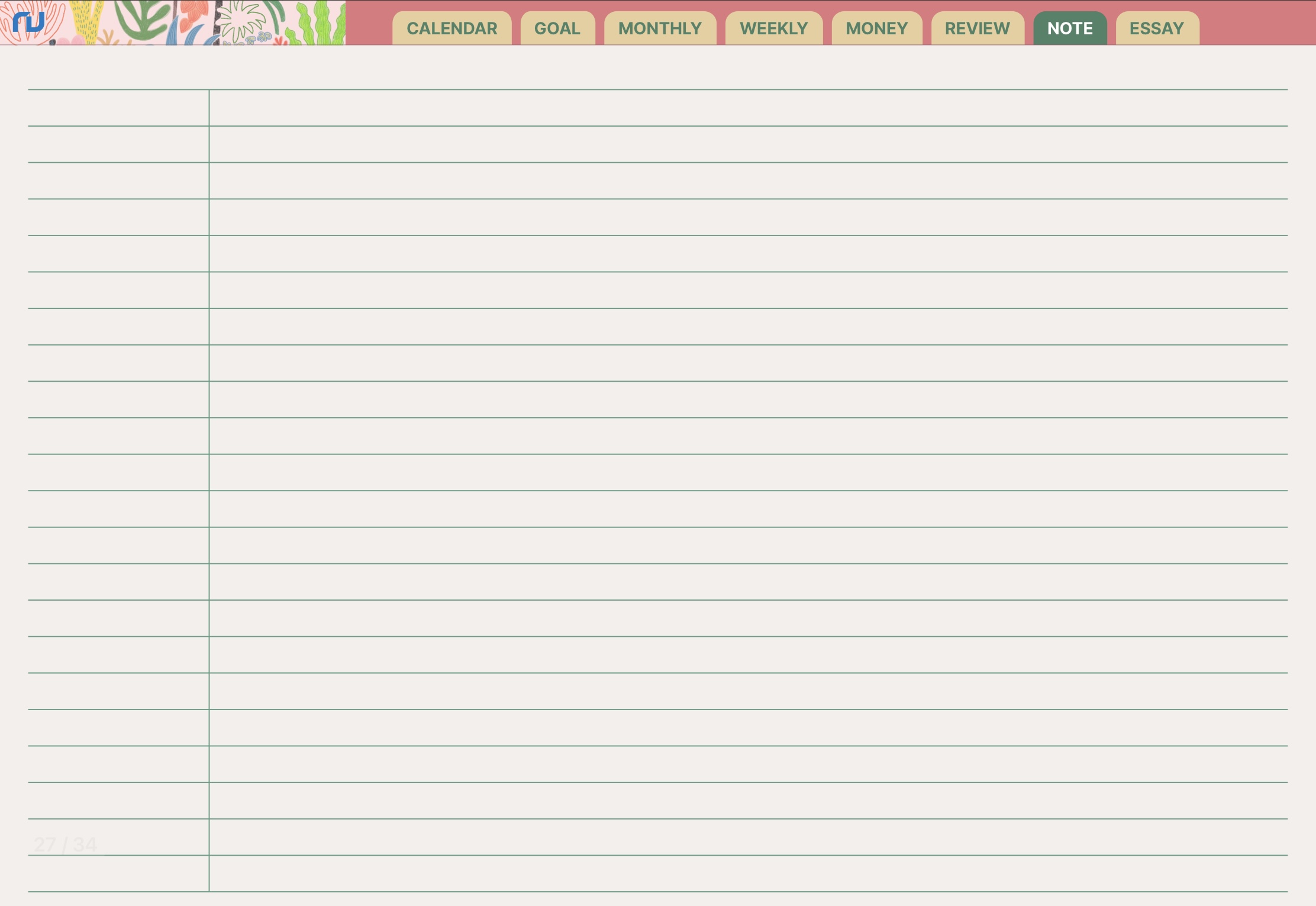 노트는 줄, 모눈종이, 백지 스타일로 되어 있습니다.