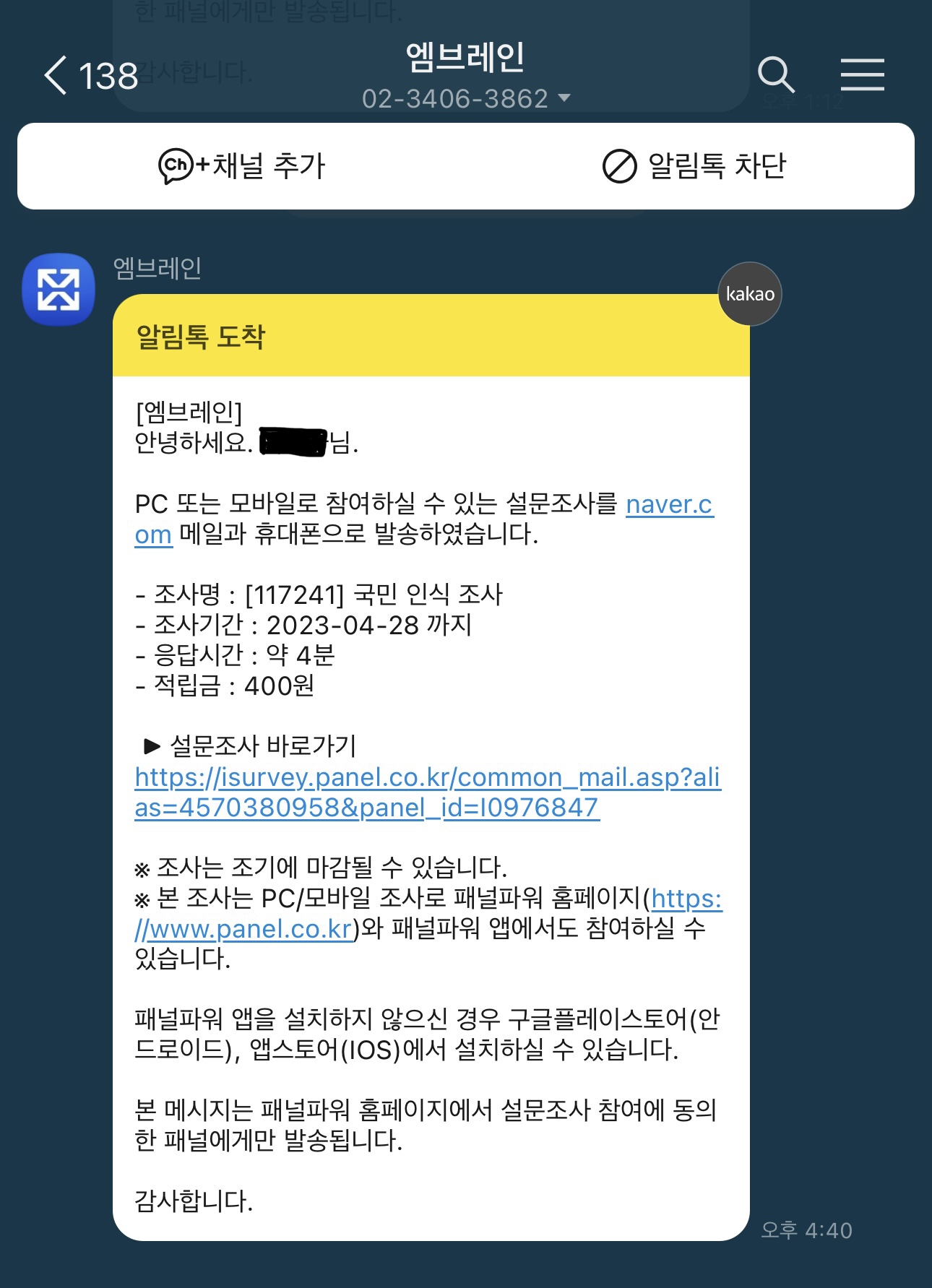 그리고 쉽게 접근할 수 있는 이유도 바로 이렇게 카카오톡으로 참여가능한 설문조사를 보내주기때문인데요.