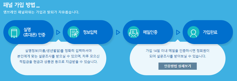 엠브레인 패널파워는 국내 1위의 리서트 사이트고 국내에서 가장 많은 수의 온라인 조사를 진행하고 있으며 가장 많은 패널(130만명)이 활동하고 있다고 하네요.