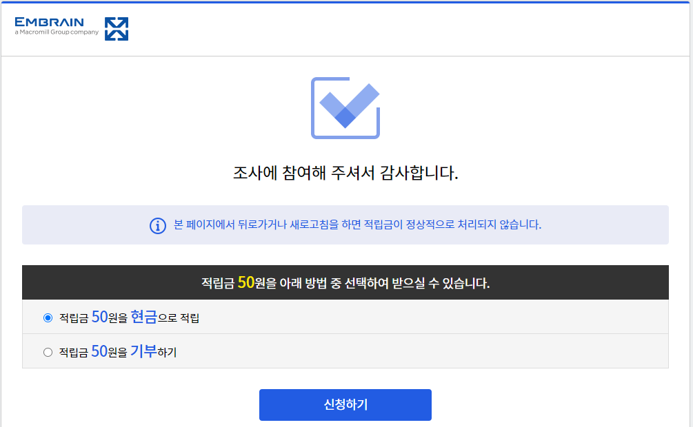조사가 끝나면 최소 50원은 받을 수 있습니다. 조사 대상에 맞지 않은 경우에는 50원을 적립받고 조사대상의 조건이 맞아 끝까지 설문조사를 이어갈 경우에는 제시된 적립금을 받을 수 있습니다.
