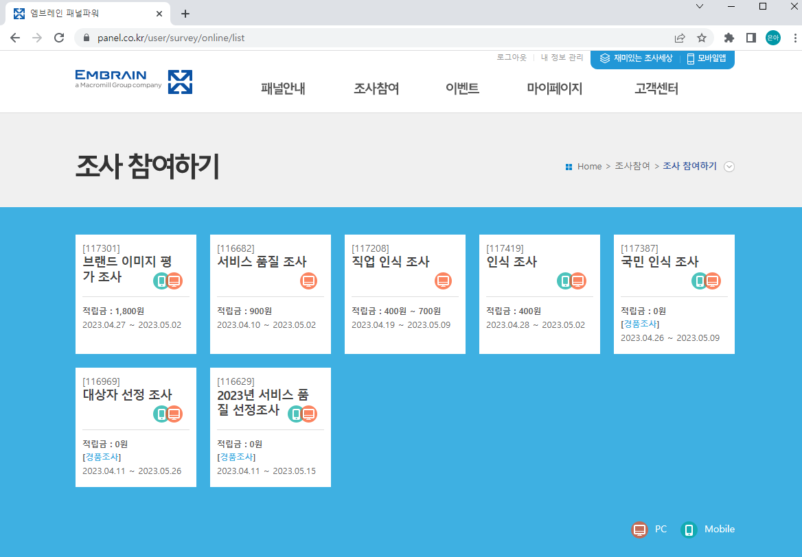 PC로 참여할 수 있는 조사들이 더 많습니다.