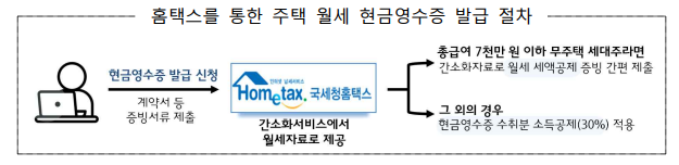 주택 월세를 지출 한 경우 홈택스를 통해 현금영수증 발급을 신청하면 연말정산 간소화 자료 현금영수증 항목의 주택임차료 거래에 반영됩니다. 세무서 담당자가 검토 후 발급하므로 연말정산 전에 신청해야 합니다.