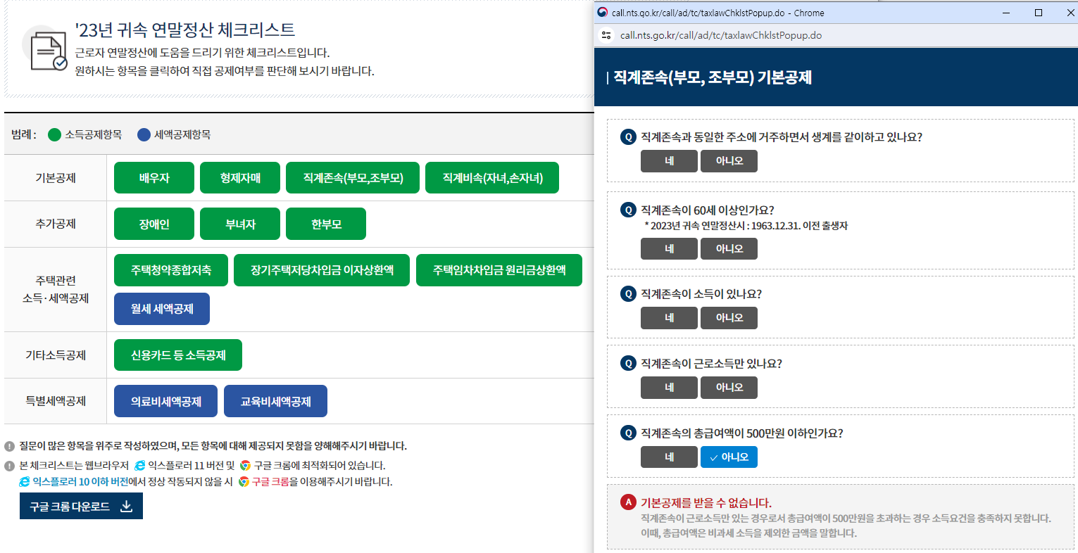 근로자 연말정산에 도움이 되는 체크리스트가 있습니다. 원하는 항목을 클릭하면 공제여부를 확인할 수 있습니다.