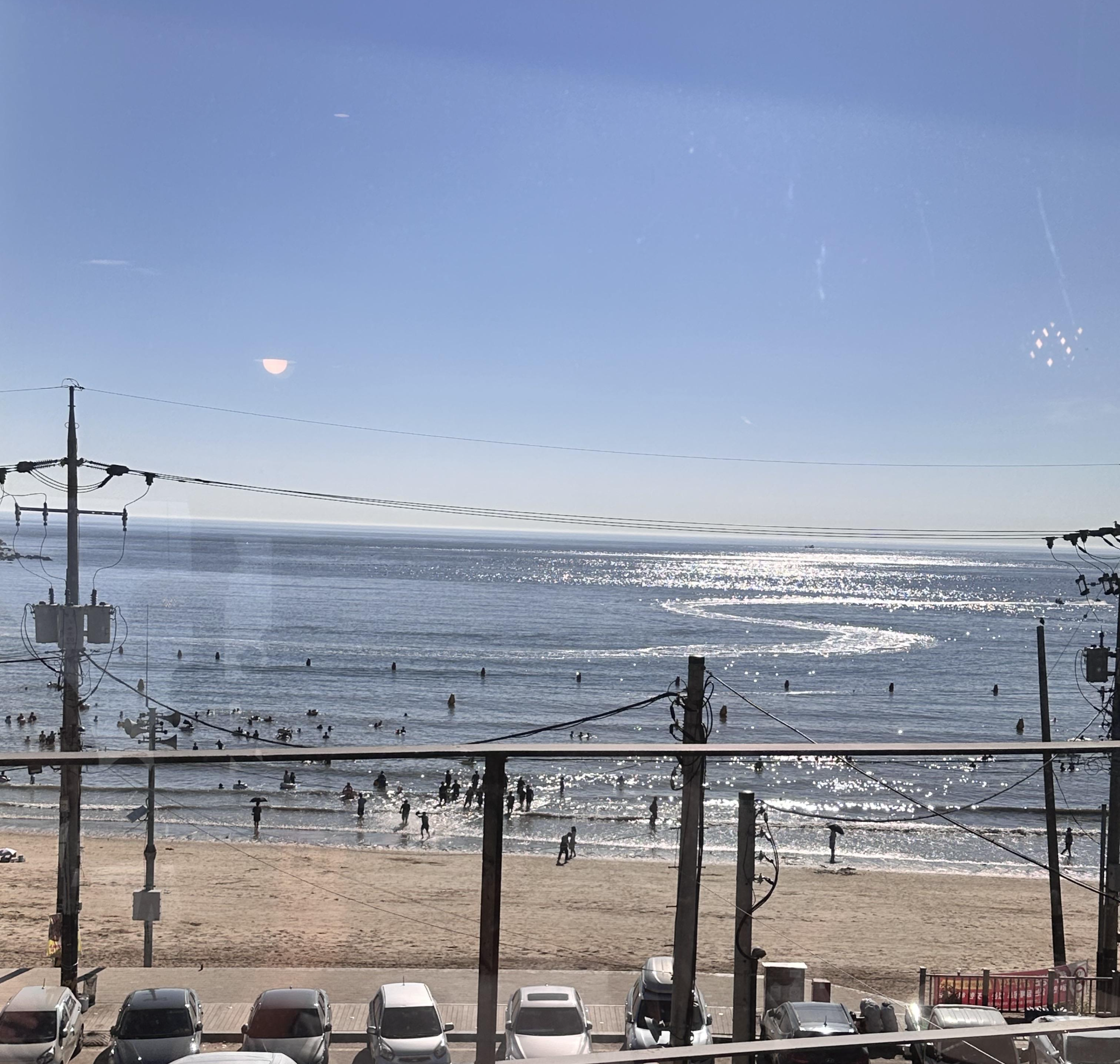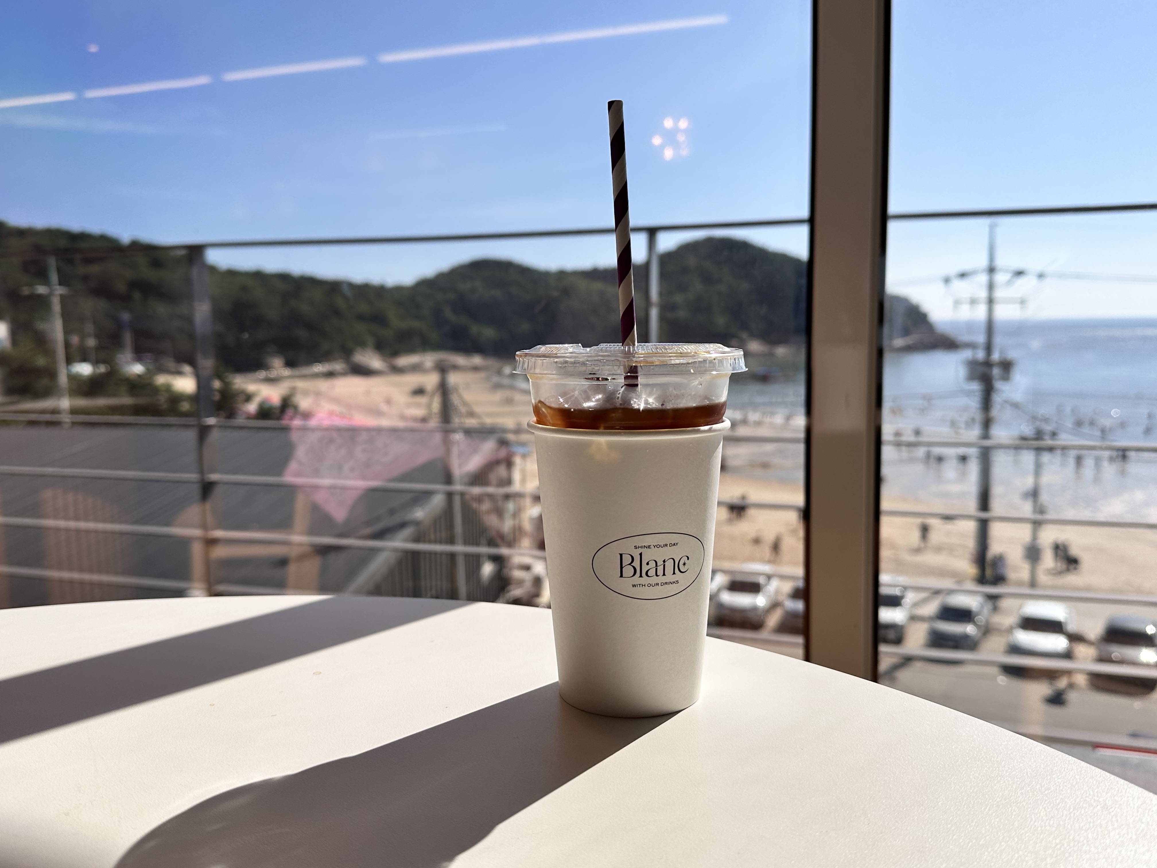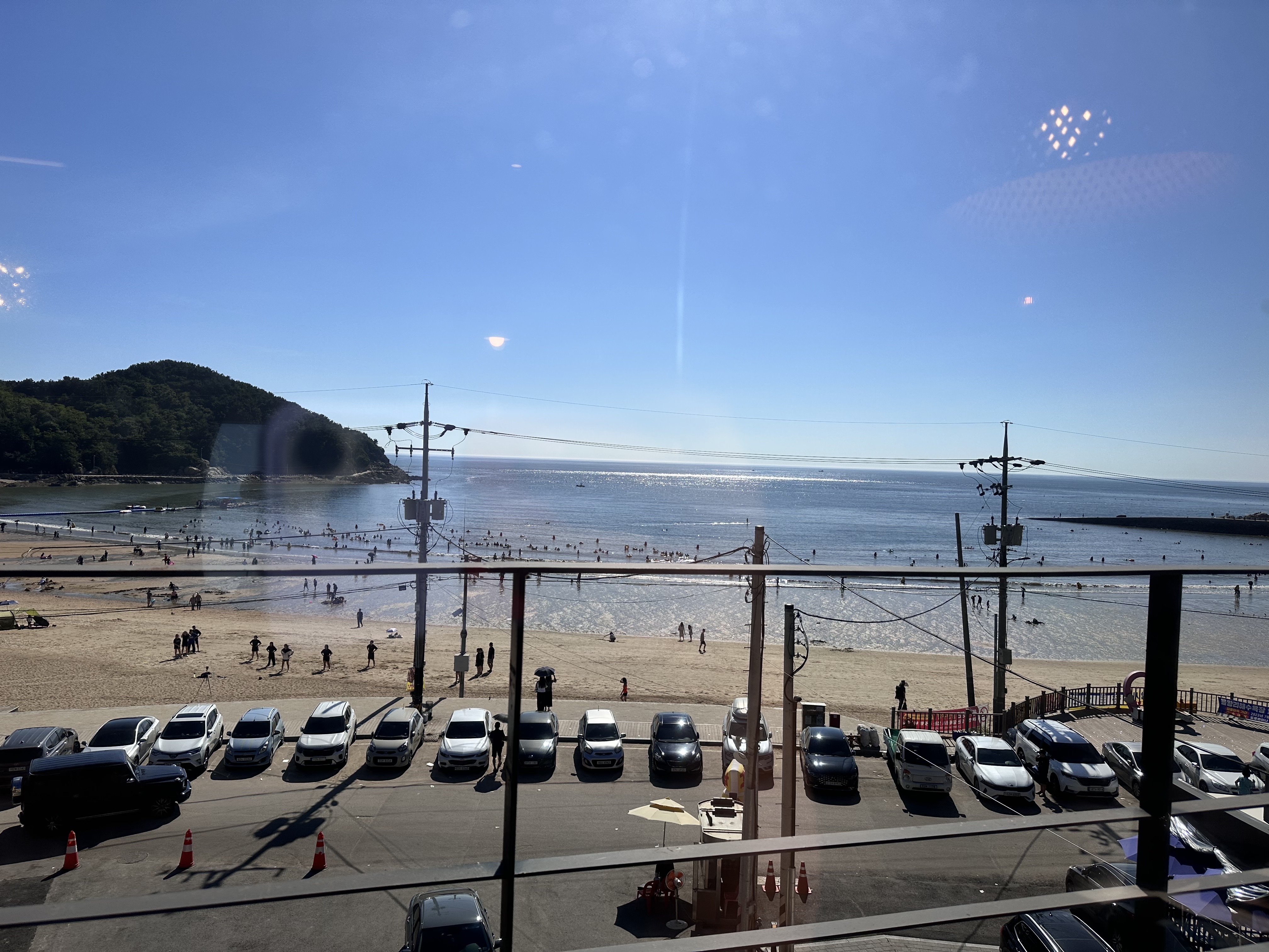 창가자리에서 보는 바다뷰는 사실 난간과 전봇대와 전선으로 시야를 방해하는 요소가 많았지만 해양스포츠를 즐기는 사람들을 따라 변하며 반짝이는 바다를 지켜보는 것만으로도 기분이 좋아지고 한참을 바라보게 됩니다.