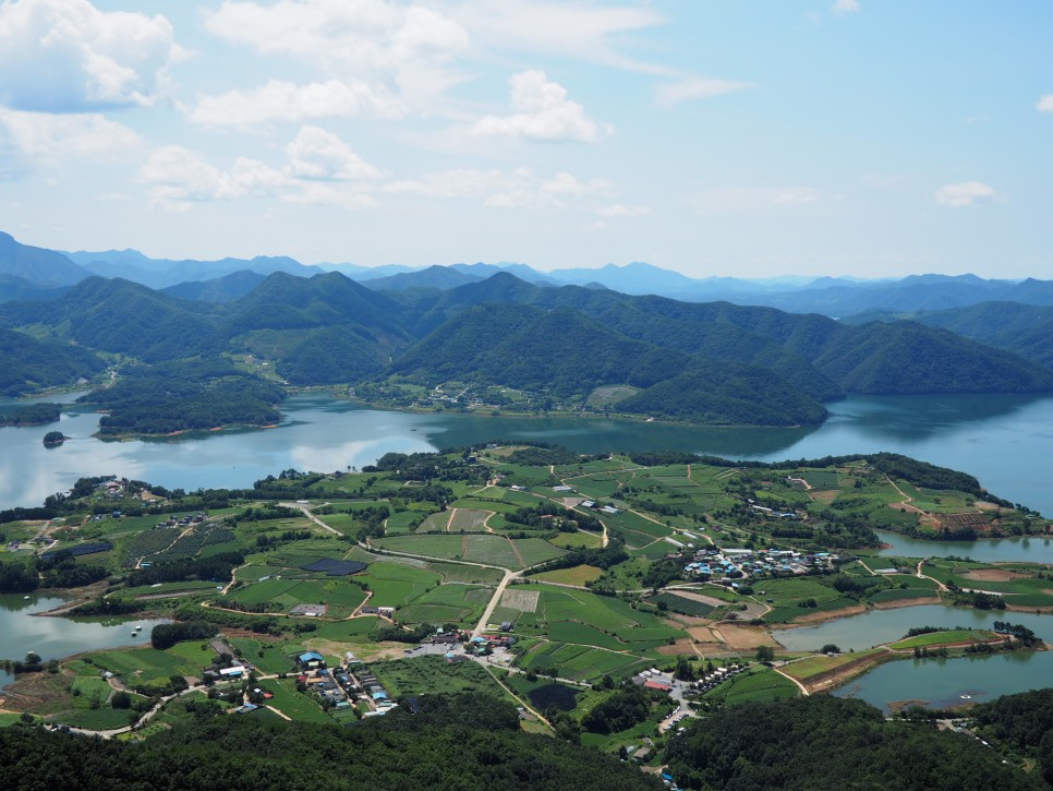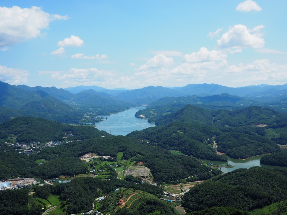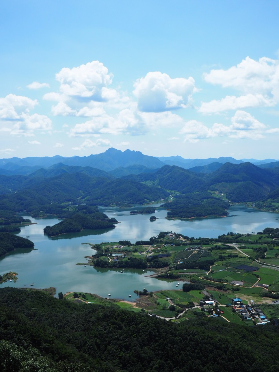 짙은 녹음의 산들과 맑은 하늘과 청풍호.