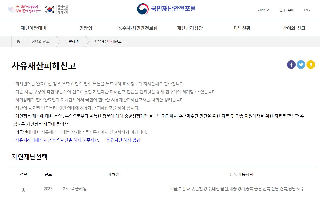 자연재난선택항목에서 선택을 하시고 개인정보동의 수집 후 신규등록하면 됩니다.