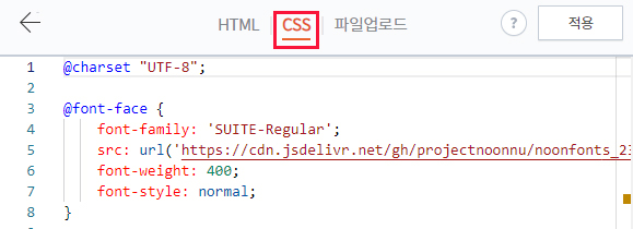 5. CSS로 들어가서 @charset "UTF-8" 아래에 눈누에서 복사한 웹폰트를 붙여넣기 해줍니다.