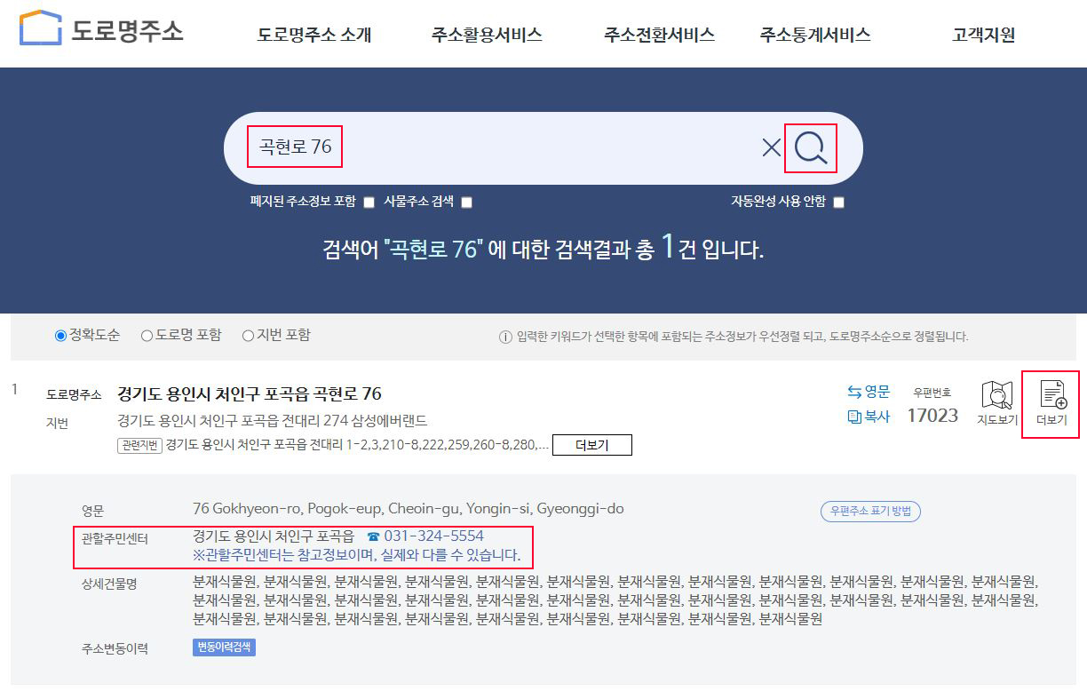 더보기를 클릭하면 해당 지역의 관할주민센터의 연락처가 나옵니다.