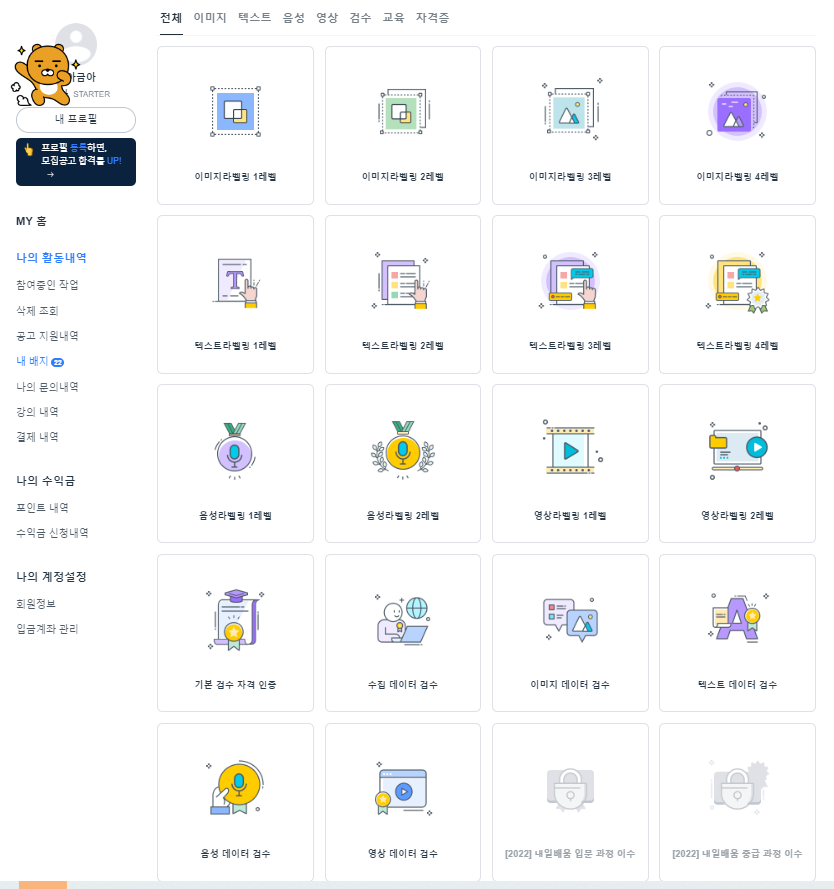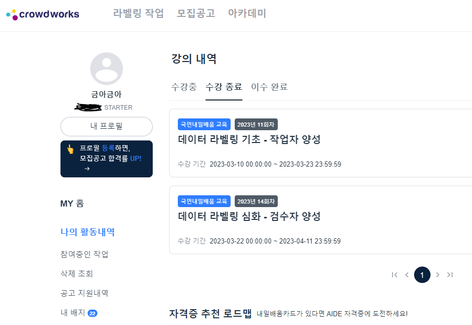 저는 데이터라벨링 기초- 작업자 양성 과정과 데이터라벨링 심화- 검수자 양성까지 수료를 했는데요.