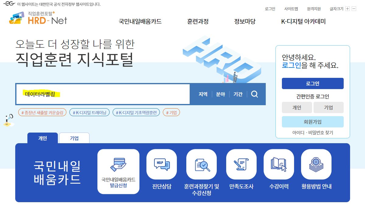 HRD-net 내일배움카드 웹사이트에 들어가면 바로 검색화면이 나옵니다.