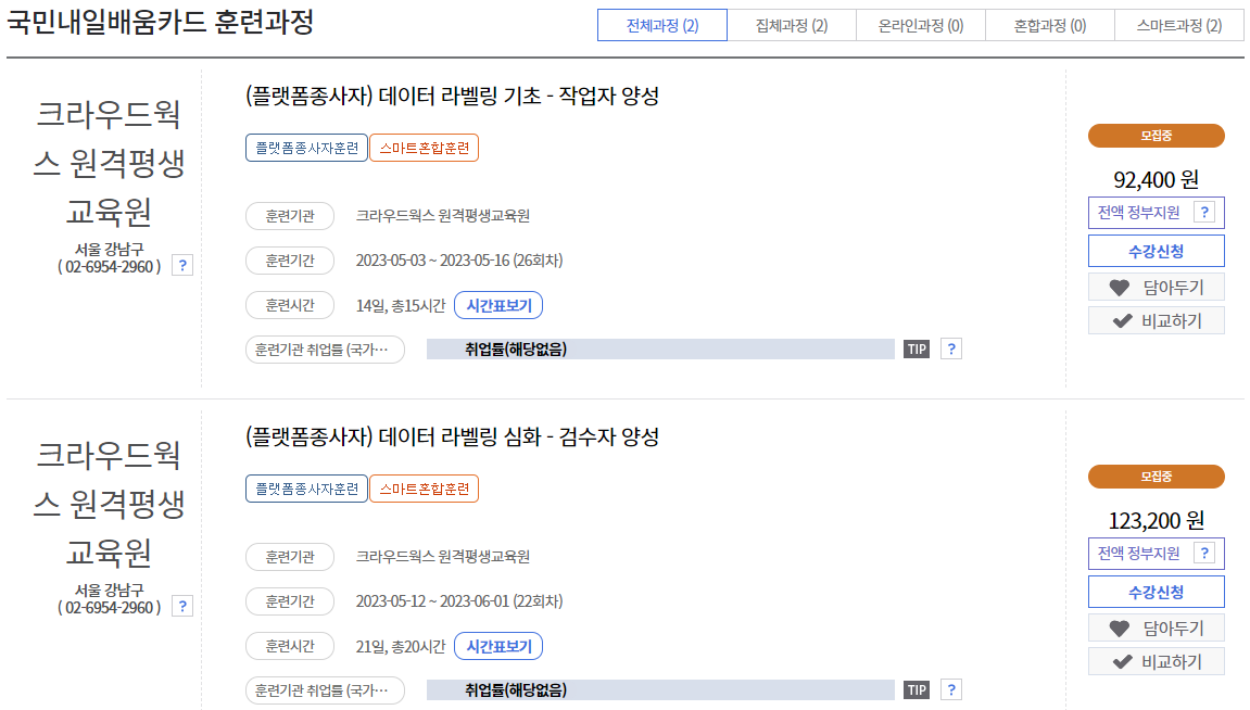 데이터라벨링을 검색하거나 크라우드웍스를 검색하면 아래와 같이 교육 과정이 나와요.